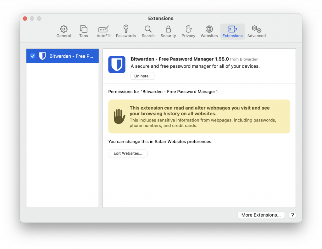 - Check the Bitwarden extension and check click the Always Allow on Every Website button, then close the preferences window.