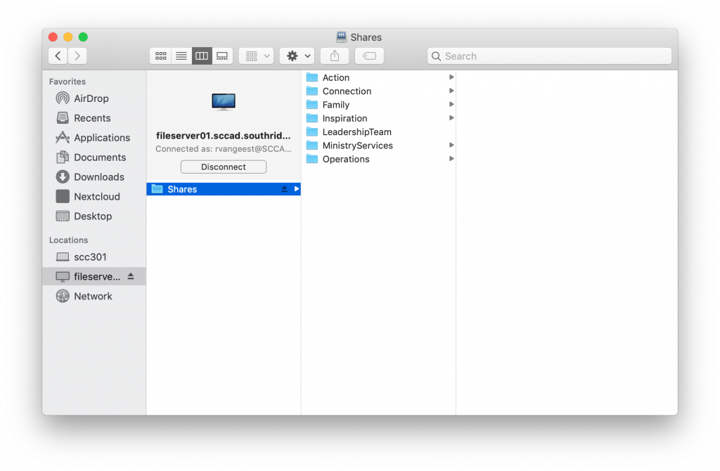 Now open a Finder window. On the right hand side under Locations should be an option called fileserver01.sccad.southridge.cc (it also should have the little eject icon beside it) when you click that you will be presented with the Shares folder!