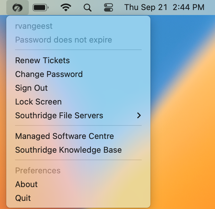 Click the Southridge icon and then choose Change Password from the dropdown menu. You’ll then be presented with a prompt to enter your current password and your new password which you will have to enter twice to confirm.