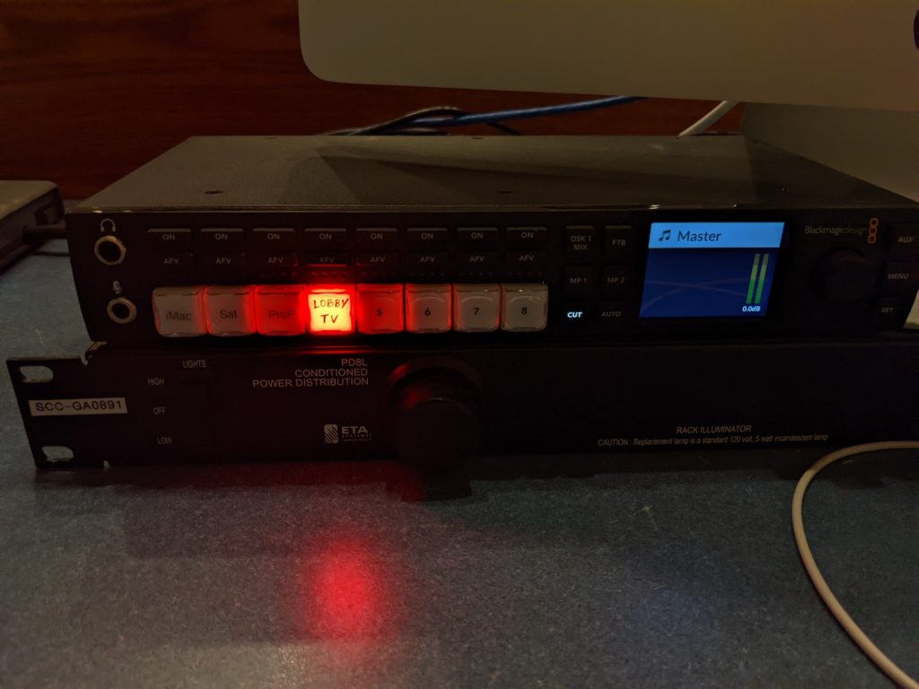 3. Under the iMac on the sound desk in the Aud is a black little box. Press the 4th big button called Lobby TVs so it is lit up red.