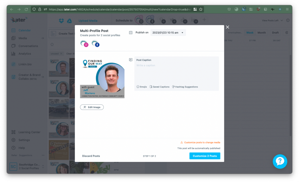 Go ahead and click that schedule 2 posts button! This will now put the posts on the calendar. They will appear as to seperate items, a Facebook post and an Instagram post.
