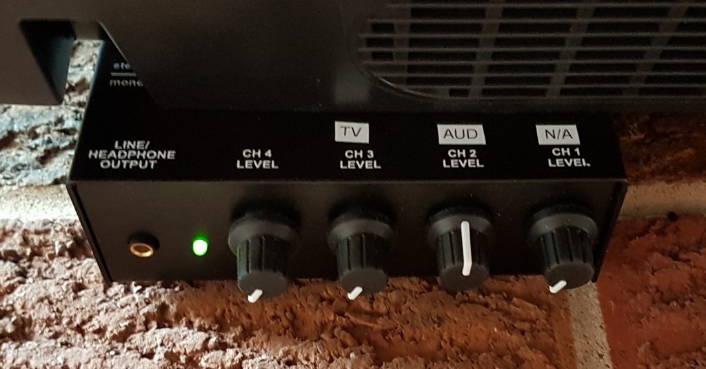 To just listen to the content from the auditorium, turn up the AUD volume knob on the mixer.