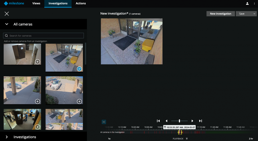 - Choose the Investigations tab. Search for the camera you need and click the + button. Your camera will appear in the New Investigation window.