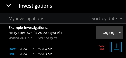 - Once saved, collapse the camera list on the left hand side and expand the Investigations list. Choose the Investigation you want and click the blue download icon.