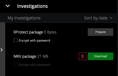 - Click the Prepare button for the type of investigation you want to download. It will take a moment to process the file depending on how many cameras and how long of a segment you selected. Once complete you will have the option to download the file.